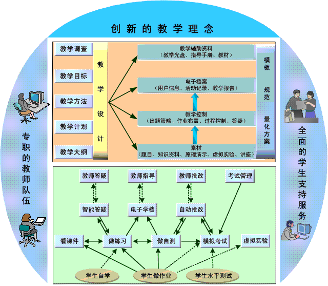 (3) 集成各种先进的网络技术和设备为学生提供全方位的服务。课程组成员与学院其他教师研究开发了先进的多媒体网络教学系统、虚拟实验系统、教务管理系统、课程网站和可在线升级的教学光盘,同时集成了国内外先进的网络教育工具,如基于Internet的实时答疑系统和直播课堂,形成完整的课程教学平台,资源建设更加规范化,便捷化,为分布在全国各地的学生提供优质的教学服务,满足网络教育导学、授课、作业、实验、答疑、考试和教学管理等各个环节的要求。