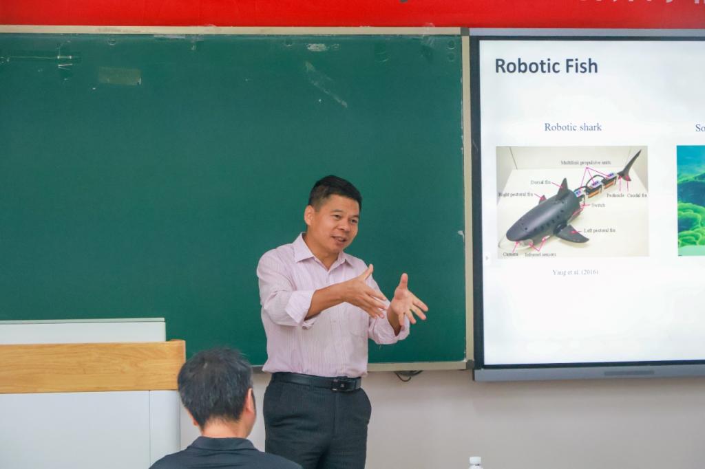 在互动问答环节,现场学生围绕技术原理、实际应用等问题积极提问。针对“双稳态比单稳态优势的理论原理”,景教授解释,双稳态通过能量突变实现节能,虽会产生一定顿挫感,但属于机制固有特性,真实鱼类也无法完全避免;关于“仿真鱼转弯实现方式”,他表示可通过调整电机周期控制尾摆轨迹达成;当被问及“湍流对仿真鱼的影响”,他指出当前实验基于水池环境,团队可根据不同水体任务需求定制鱼体体态;对于“设计灵感是否源于鱼脊柱仿生”、“是否需特殊电路配合模式切换”等问题,他明确回应,灵感源于非线性结构力学,而非仿生鱼脊柱,且现有电路可满足模式切换稳定性与能效需求,无需特殊设计。