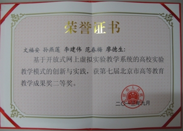由北京邮电大学网络教学系统研究中心文福安教授与孙燕莲、李建伟、范春梅、廖德生老师共同完成的“基于开放式网上虚拟实验教学系统的高校实验教学模式的创新与实践”荣获第七届北京市高等教育教学成果奖二等奖。